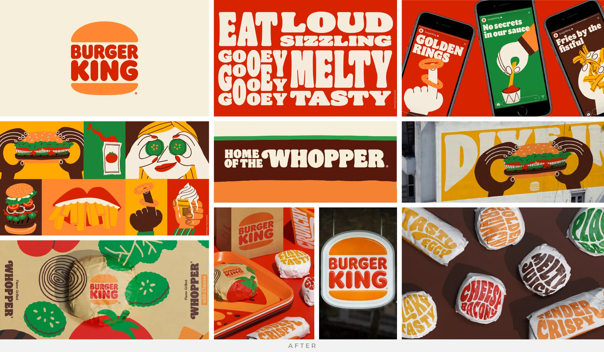 Burger King’s rebrand in 2021 represented a strategic response to the evolving tastes and preferences of consumers, as well as the need to stand out in a crowded market. The revamp was imperative to rejuvenate the brand’s image and rekindle consumer interest, particularly among younger demographics increasingly drawn to more contemporary and health-conscious options. By embracing a modern, minimalist aesthetic while retaining elements of nostalgia, Burger King aimed to strike a delicate balance between honoring its heritage and appealing to a new generation of customers. Leading the retro revival, they ditched their 1999 logo in favor of a flat design reminiscent of the logo used by the brand throughout the 1970s-90s. The simplified logo uses a custom typeface and a fresh color palette directly inspired by the food itself. The revamped branding pays homage to the brand’s heritage with a refined design that is confident, bold, and refreshingly familiar.